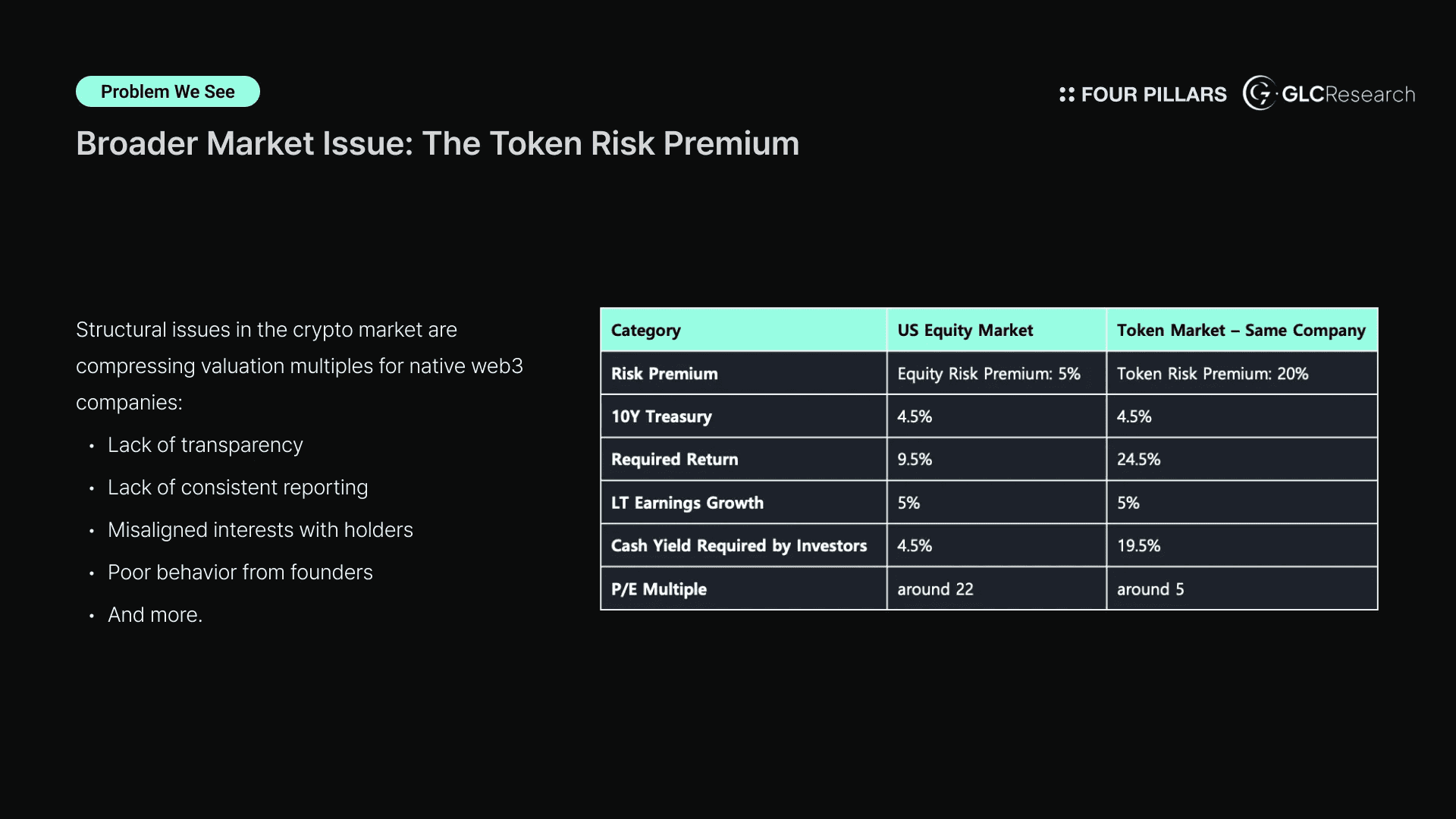 Equities carry a risk premium. Investors expect higher returns than the risk-free rate because they take on additional risk. Tokens follow the same logic, but crypto’s structural risks are far higher. Investors demand much greater returns, far beyond the ~9.5% they might expect from equities.