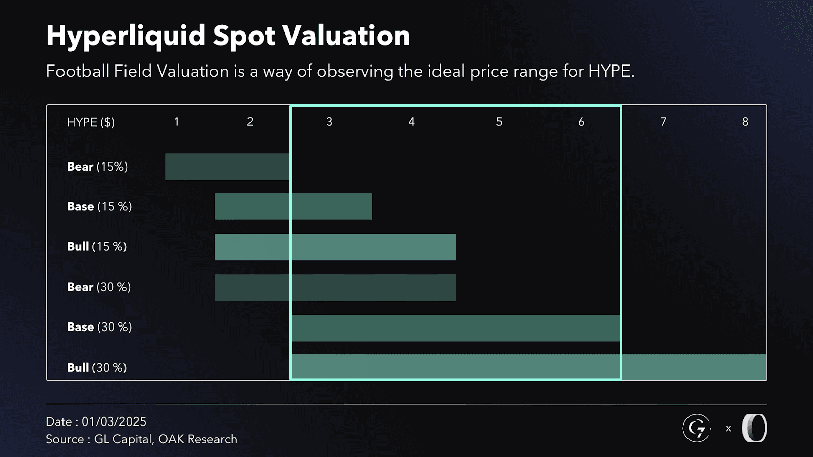 Given the uncertainty surrounding the volume going forward, using a football field valuation allows us to identify the most likely valuation range for the Perps segment. As illustrated, only two price points—$11 and $12 per $HYPE—appear consistently across the three scenarios, making this range the most statistically probable outcome.