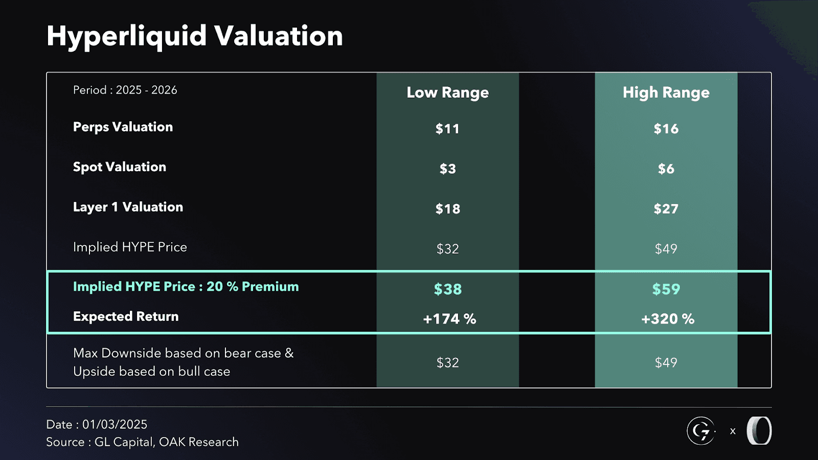 Combining all components, our model—along with a degree of subjectivity—assigns a price range of $32 to $49 per $HYPE. Additionally, we factor in a 20% premium, recognizing that Hyperliquid has several catalysts that could further drive its valuation. We also believe that using a 15x multiple for such a high-potential company remains conservative.