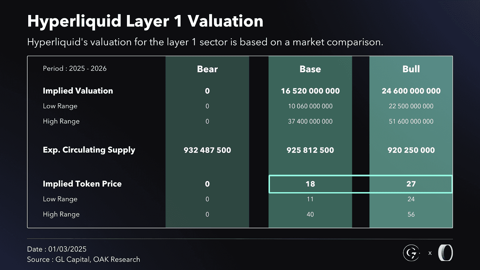 This part of the valuation carries subjectivity, but given how the market historically values L1s, these assumptions are reasonable. We estimate the L1 valuation to fall within a range of $18 to $27 per $HYPE.