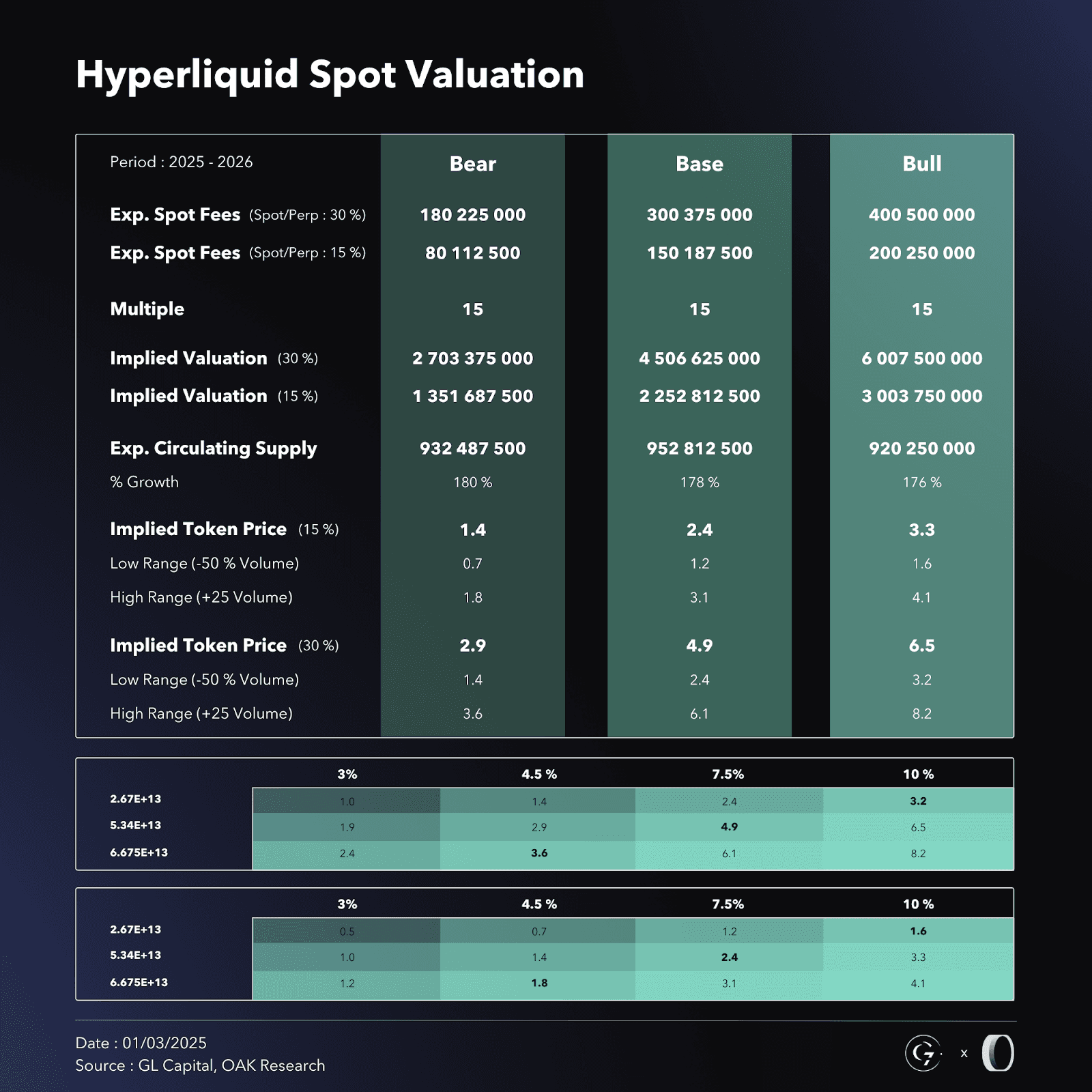 The Spot valuation is more straightforward. Among CEXs, spot trading volume typically represents around 18% to 30% of Perps volume. Based on this trend, we assume Hyperliquid’s Spot trading volume will reach between 15% and 30% of its Perps volume.