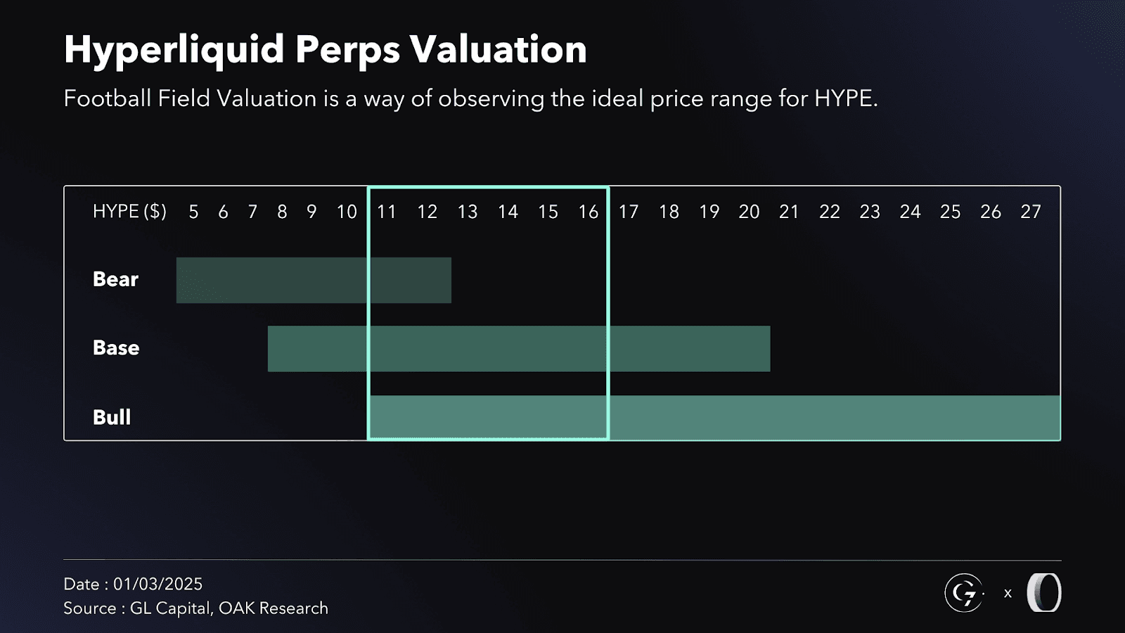 Sum-of-the-parts valuation includes perps, spot, and L1 components, with the Perps segment alone justifying a price between $11–$16.