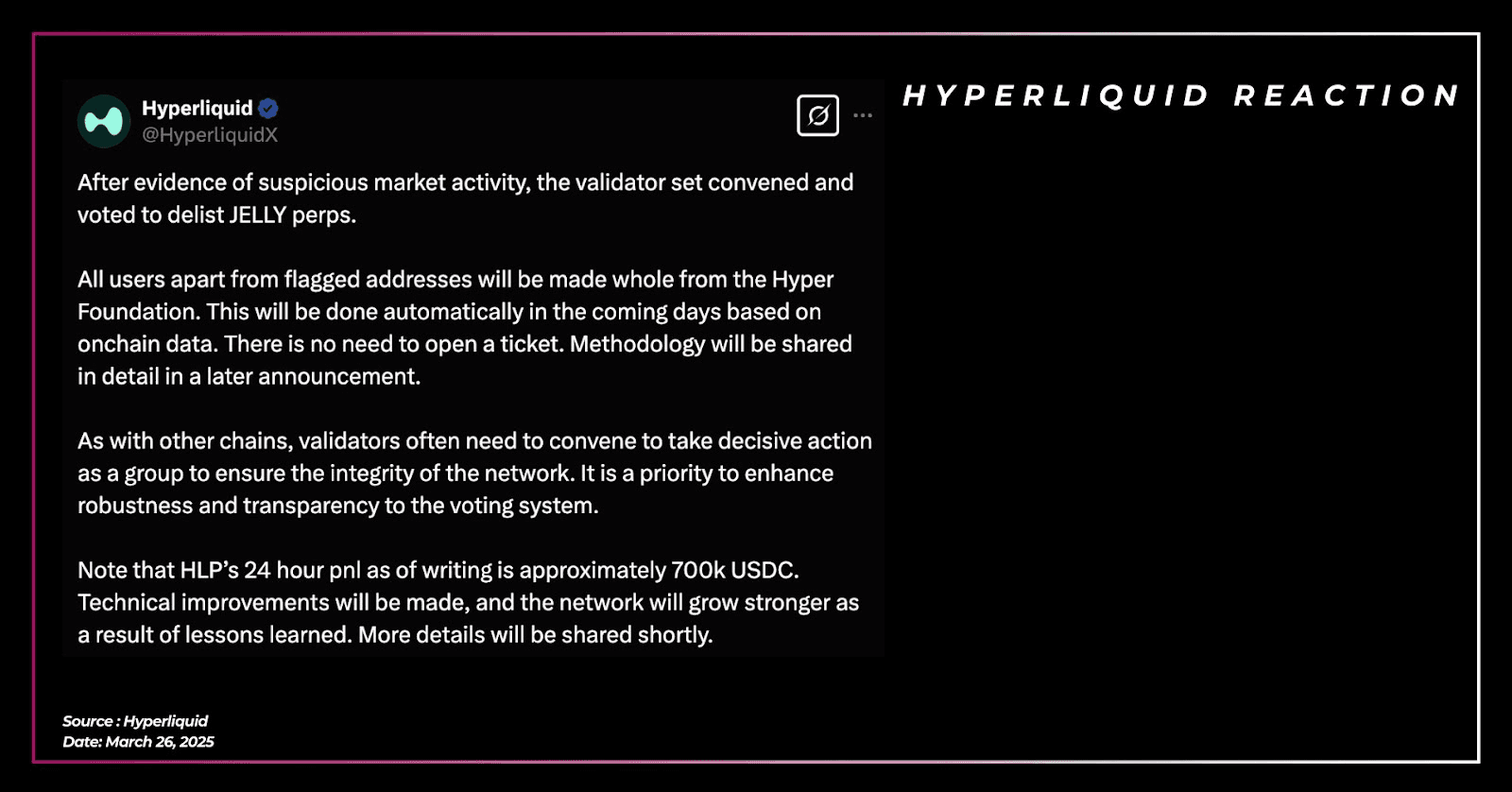 Once the $JELLY listings went live on CEXs, Hyperliquid had a decision to make — and inaction wasn’t an option. Allowing the protocol to collapse in the name of “decentralization” was never on the table.