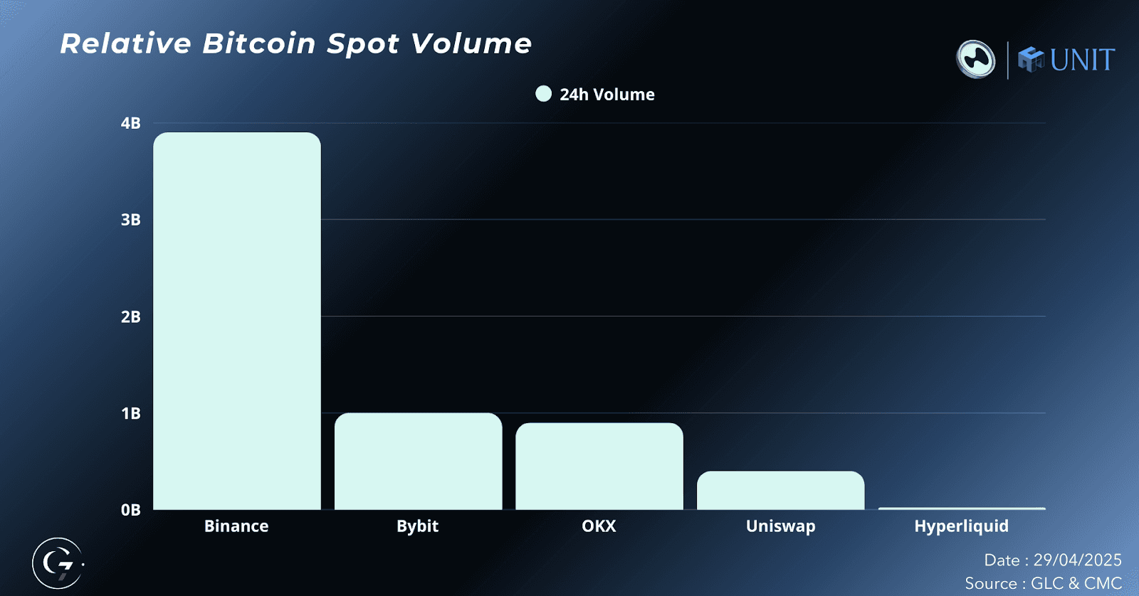 HL spot market has already seen significant growth thanks to Unit, now ranking as the third-largest DEX for Bitcoin volume. But the opportunity remains massive. Compared to total Bitcoin trading activity, it’s still just a drop in the ocean.