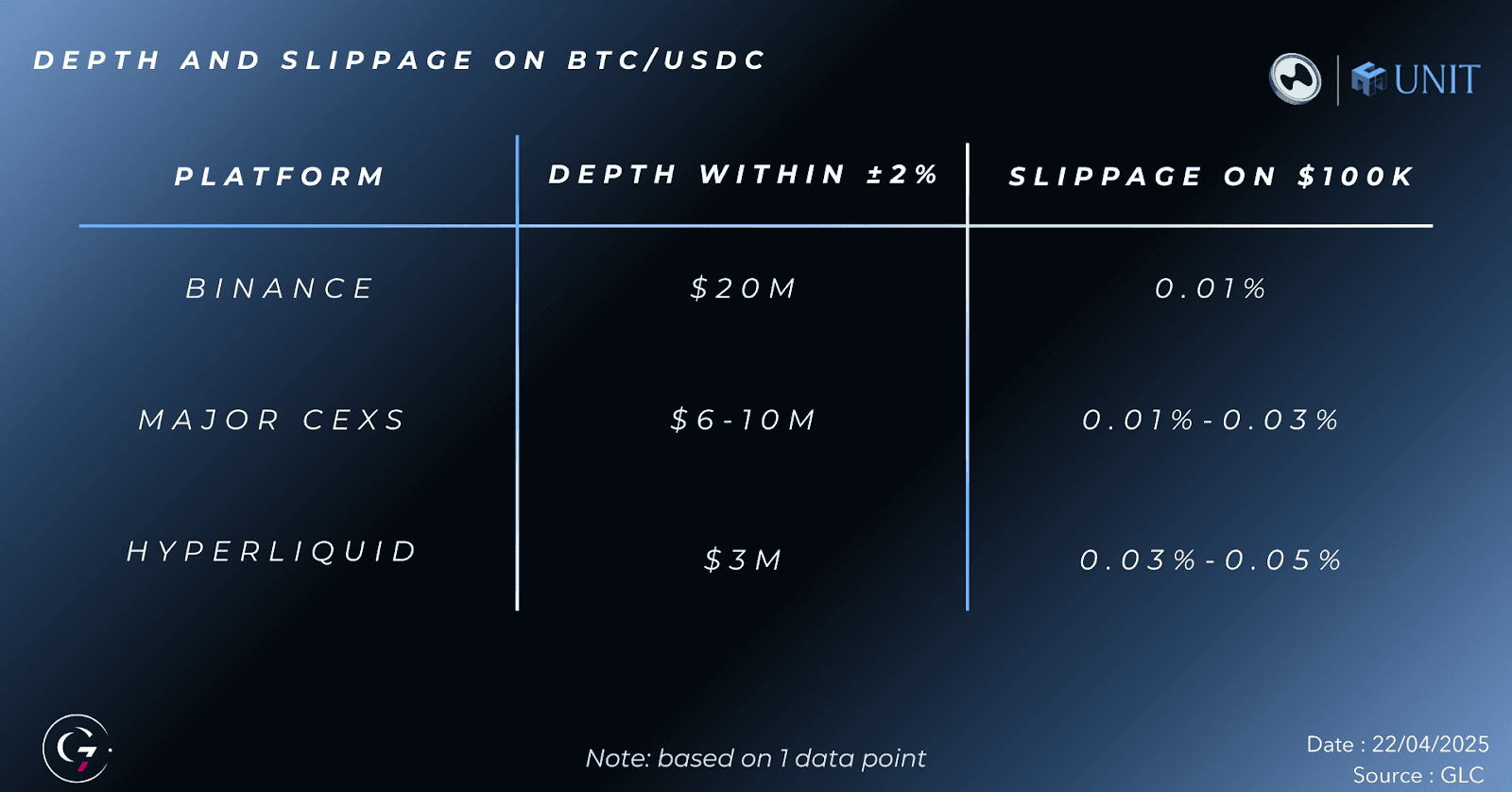 One of the common claims about HL is that it offers CEX-level liquidity. Let’s look at key liquidity indicators for the BTC/USDC pair and benchmark them against major CEXs.