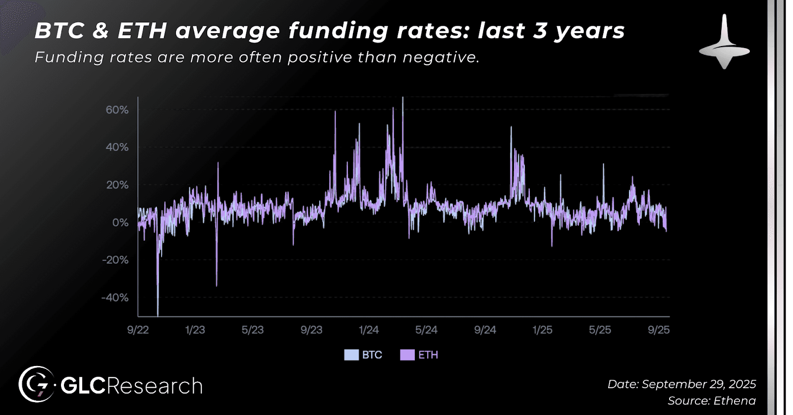 As shown in the chart below from Ethena (focused on $BTC and $ETH), traders are long-biased: funding rates are more often positive than negative.