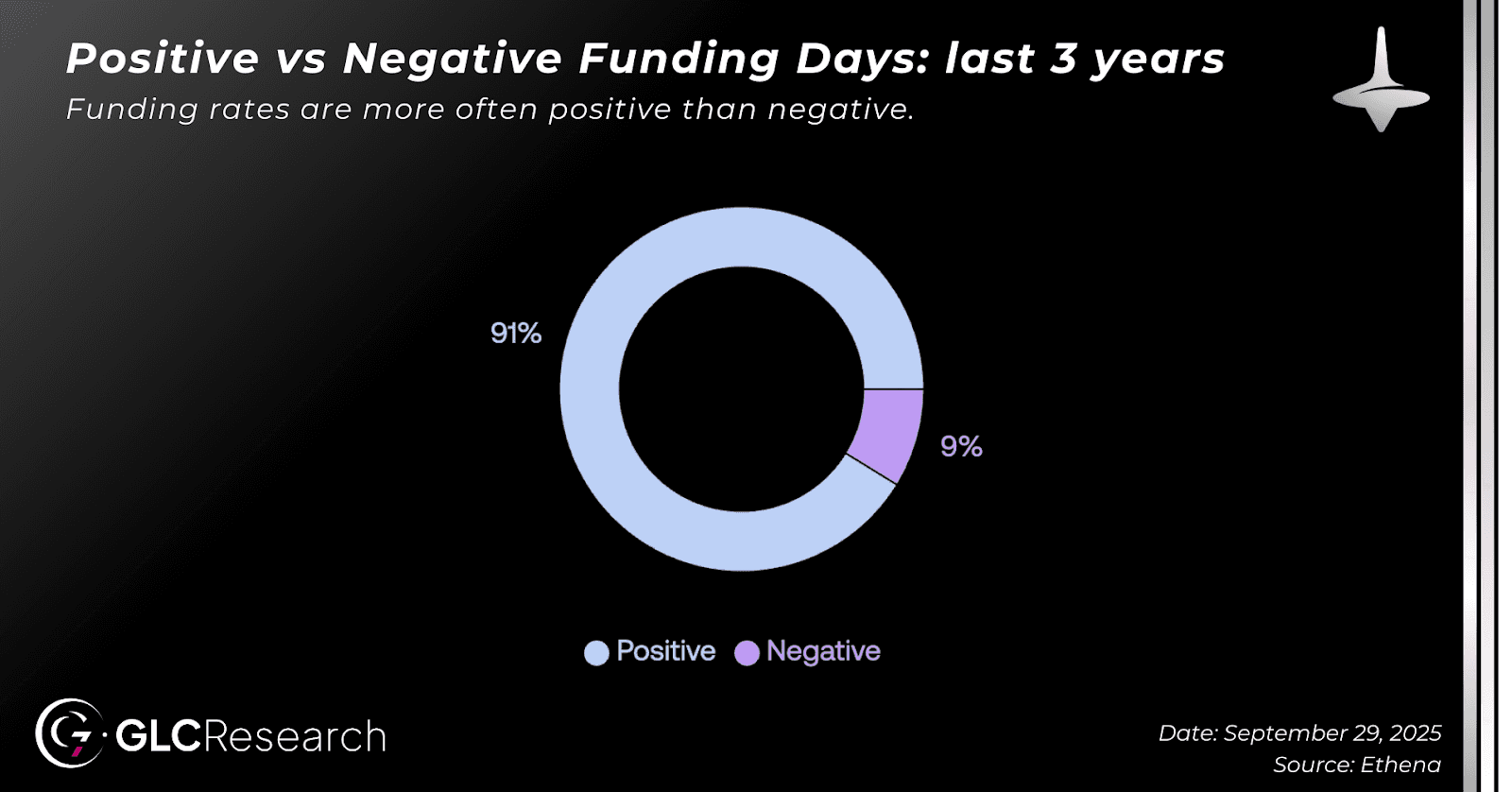 In fact, over the past three years, Ethena reports that 91% of the time funding was positive, meaning returns were available through delta-neutral strategies.