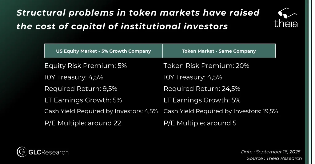 This matters because even under similar growth assumptions, crypto tokens naturally trade at lower valuation multiples than equities. The reason is structural: the risk premium on tokens is significantly higher due to structural risks. Investors require higher returns to compensate for these higher risks, which leads to “compressed” valuations.